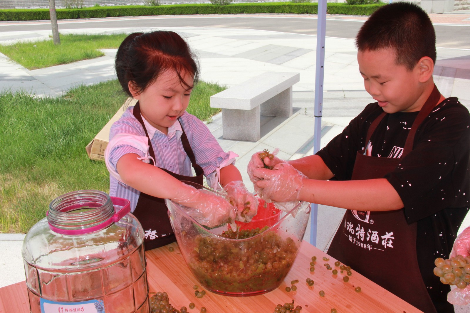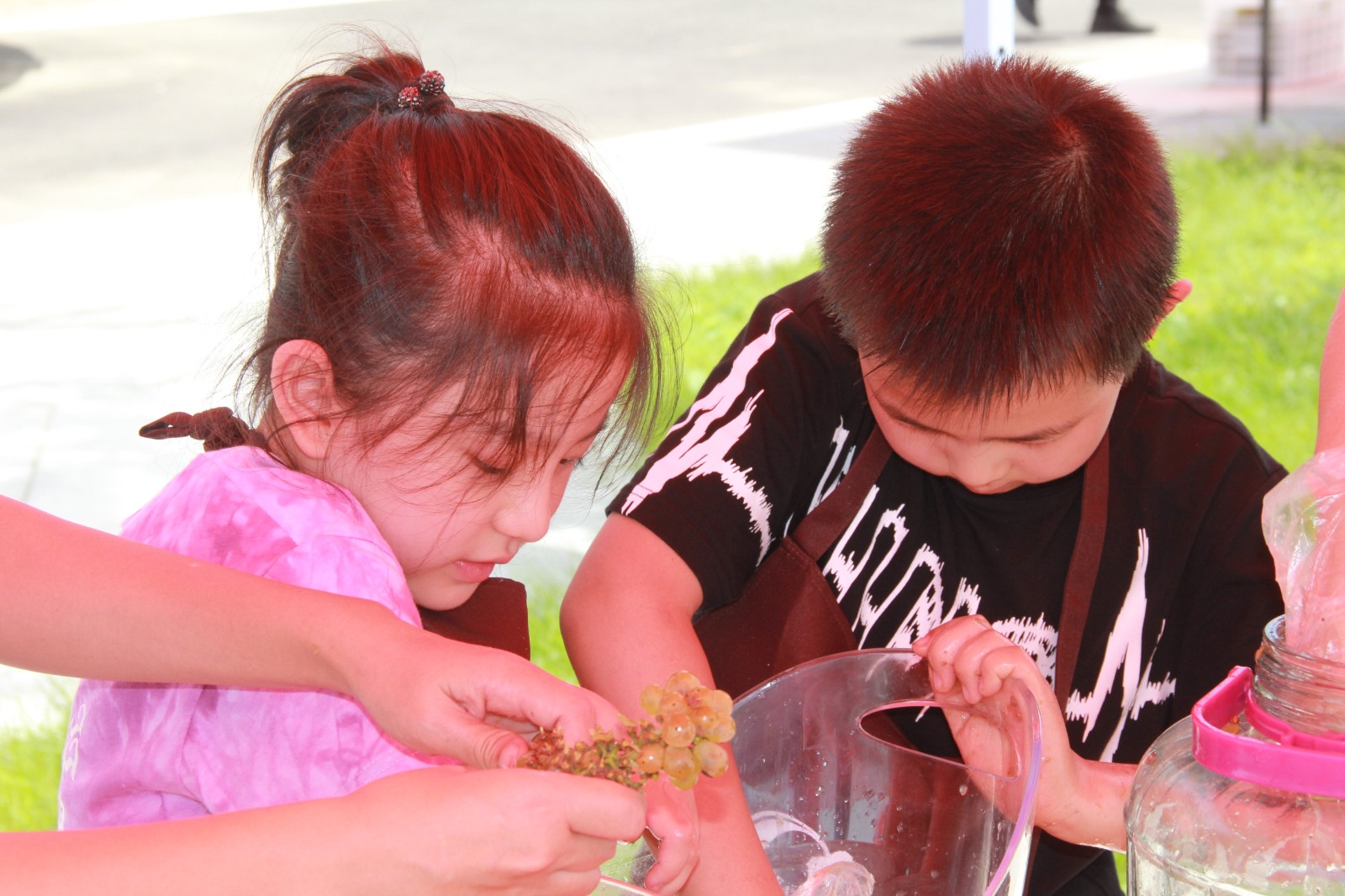 體驗釀酒:在酒莊專業人員的指導下,大、小朋友們親手將自己采摘的葡萄進行除梗—破碎—裝瓶。