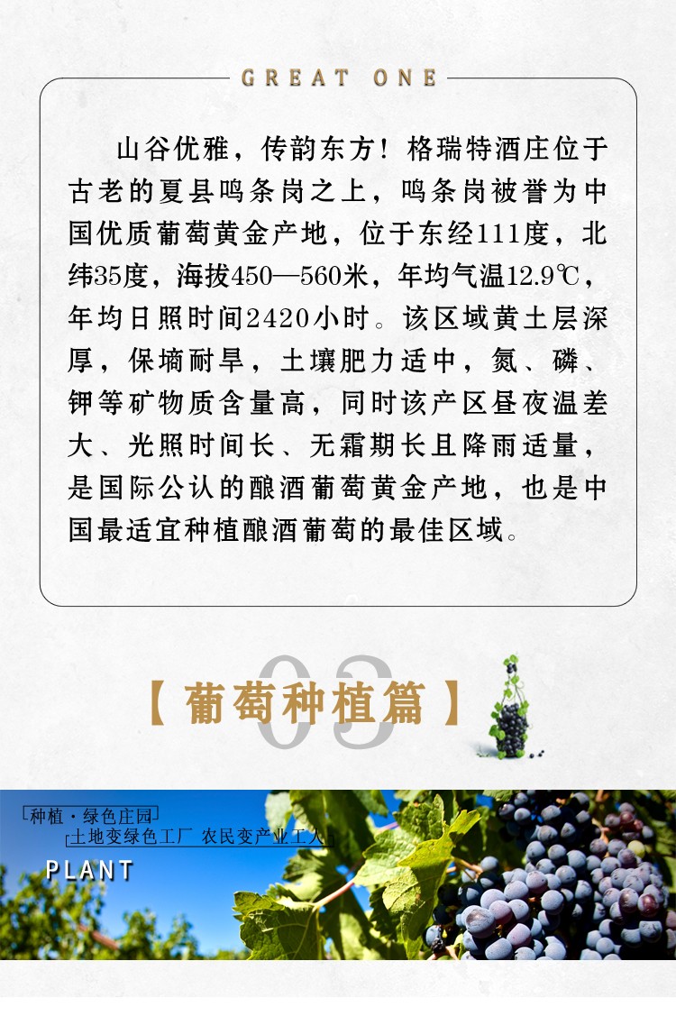 山西格瑞特酒莊有限公司成立于上世紀80年代,是一家集釀酒葡萄種植,釀酒生產(chǎn),農(nóng)業(yè)產(chǎn)業(yè)化,工業(yè)旅游化為一體